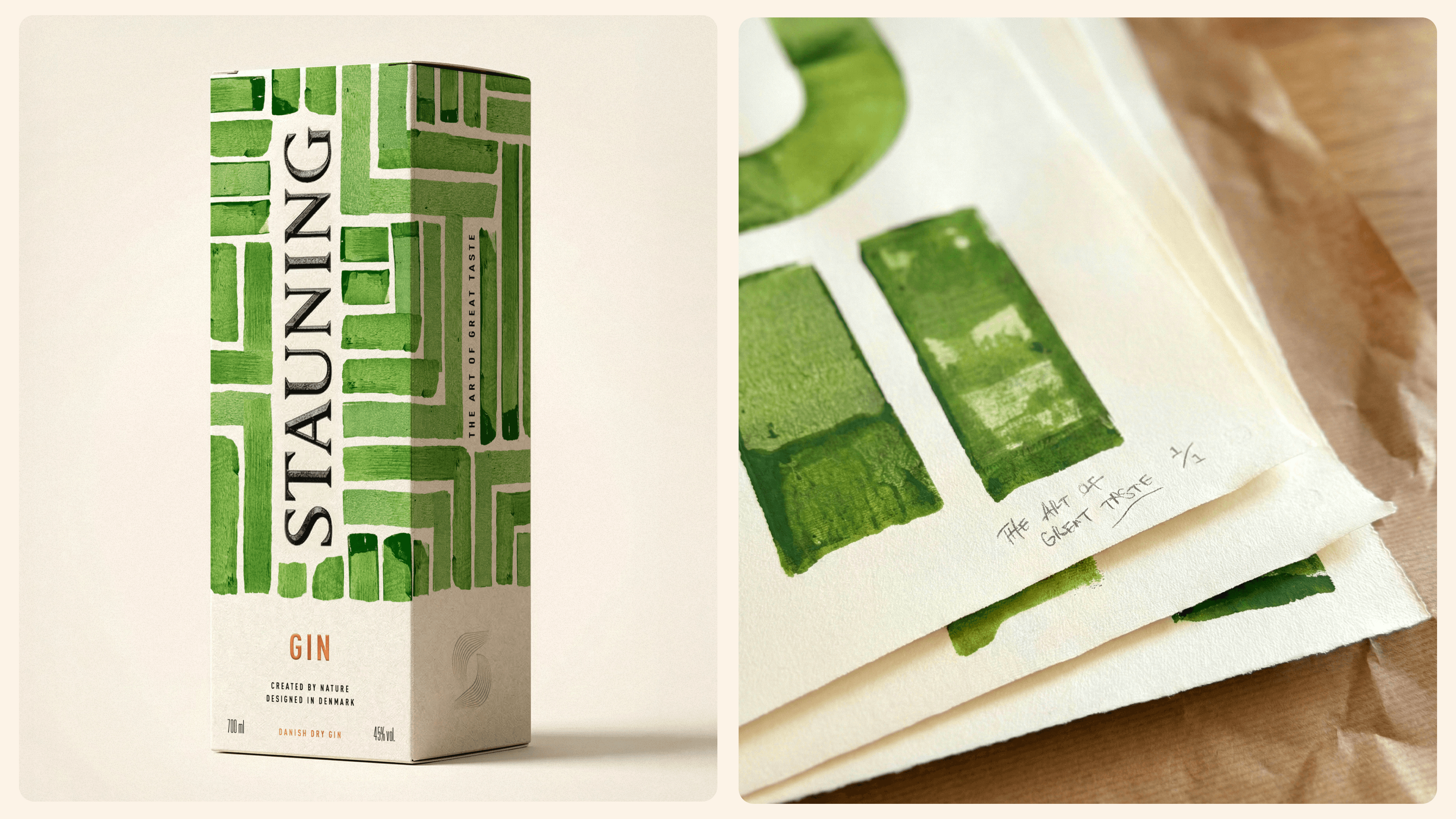 For Stauning Gin, Within Design Studio creates a system that translates traditional Danish printmaking into a spirits identity full of texture and discovery. The outer box features a grid of hand-painted green forms that resemble carved woodblock prints, where imperfect edges and layered tones give the artwork an ink-pressed quality. This pattern draws from Nordic craft traditions. The typography adds a sense of contrast against the expressive pattern, and the color palette leans into natural greens paired with soft off-white paper tones.
